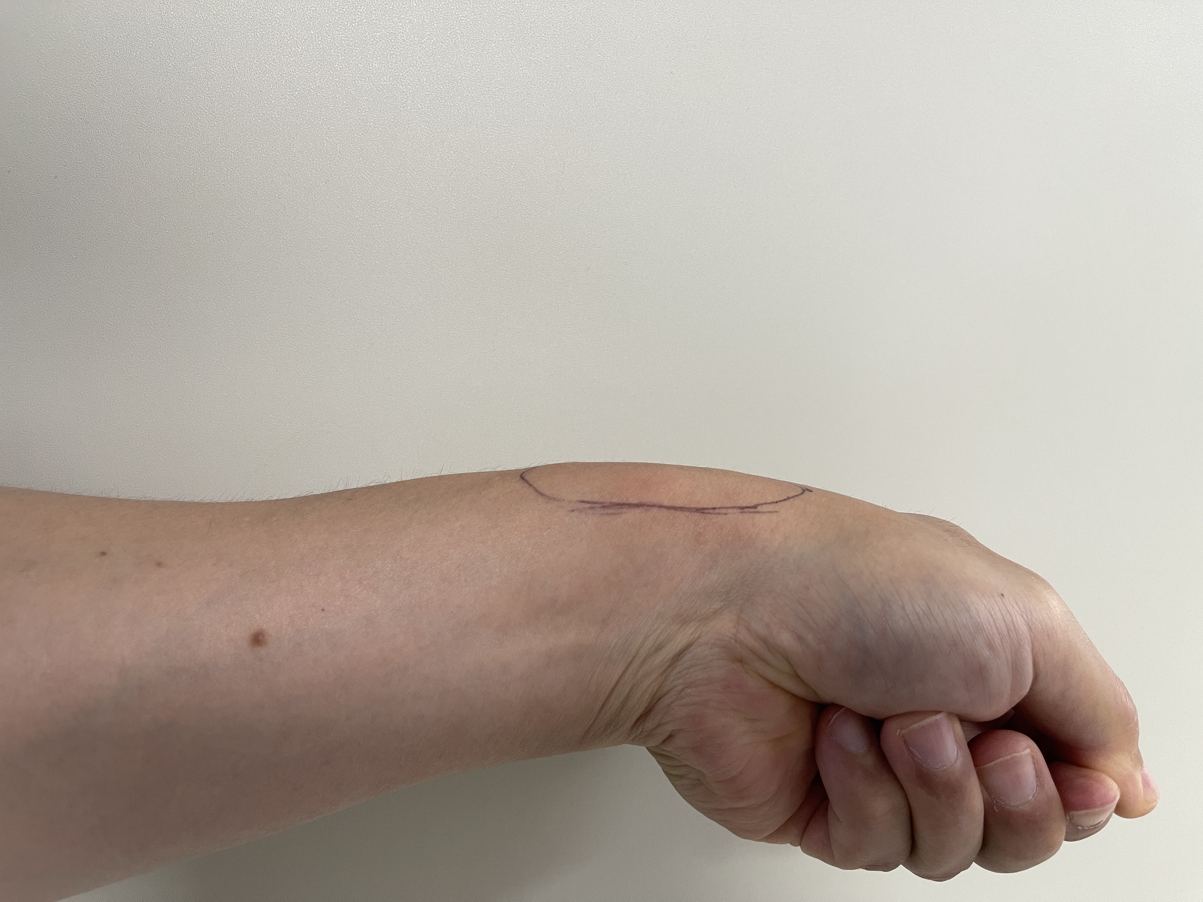 볼펜으로 그려놓은 부위가 바로 출산후 손목통증의 부위입니다.
