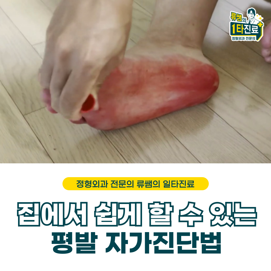 오늘은 걷는 운동을 많이 하거나 컨디션이 안좋아지면 생기는 발 통증으로 내원한 77세 여자 환자분입니다. 환자분은 심한 평발을 가지고 있었고 평발로 인해서 발생하는 거골하 관절 부위에 염증으로 인해서 통증이 발생하는 것입니다. 오늘은 우리가 집에서 쉽게 확인 해 볼 수 있는 평발 자가 진단법에 대해서 한번 알아 보겠습니다.