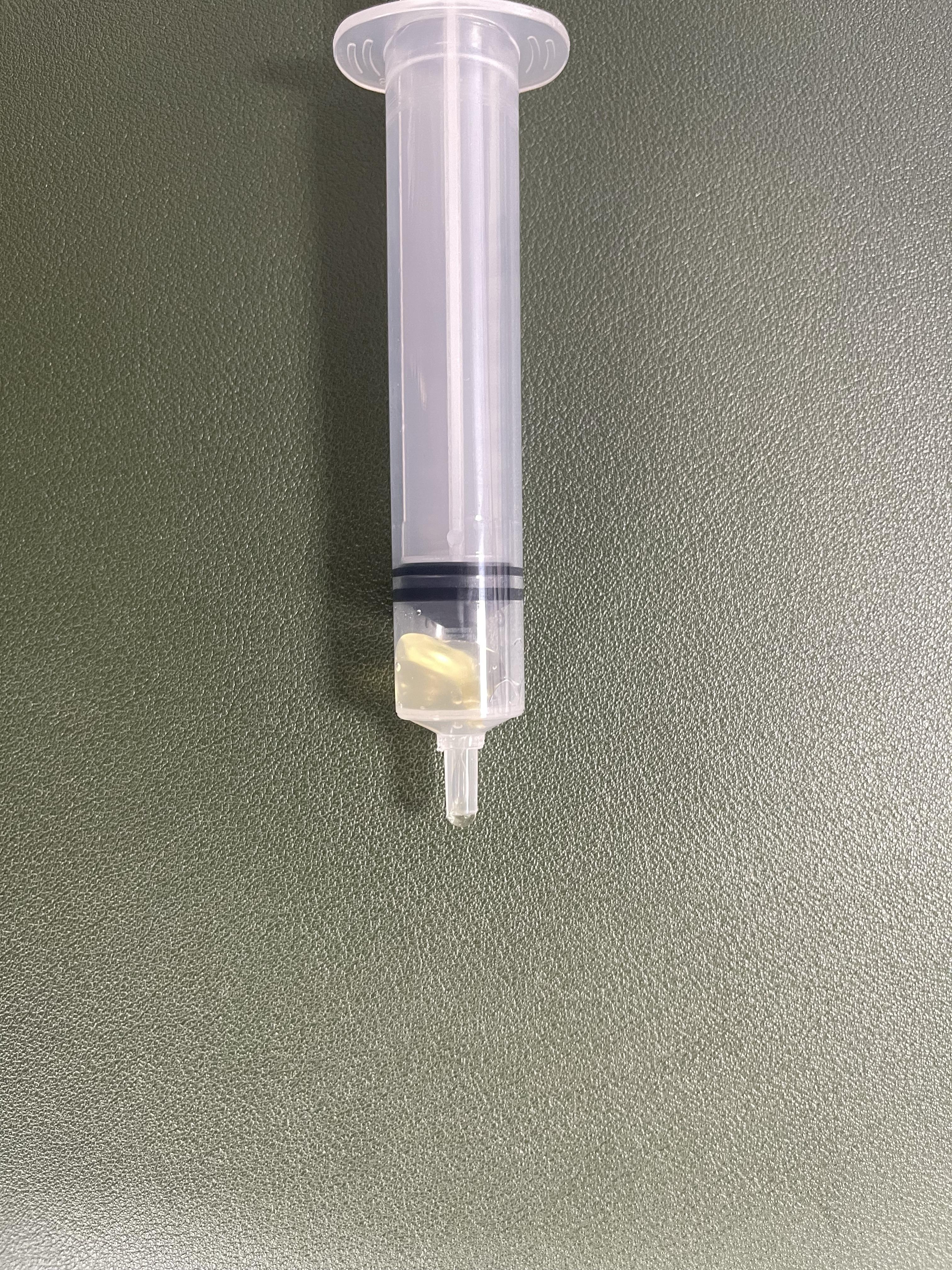 실제로 1cc 정도의 젤리 같은 액체가 나왔습니다. 간혹 주사기로 제거가 안되는 결절종도 있습니다.